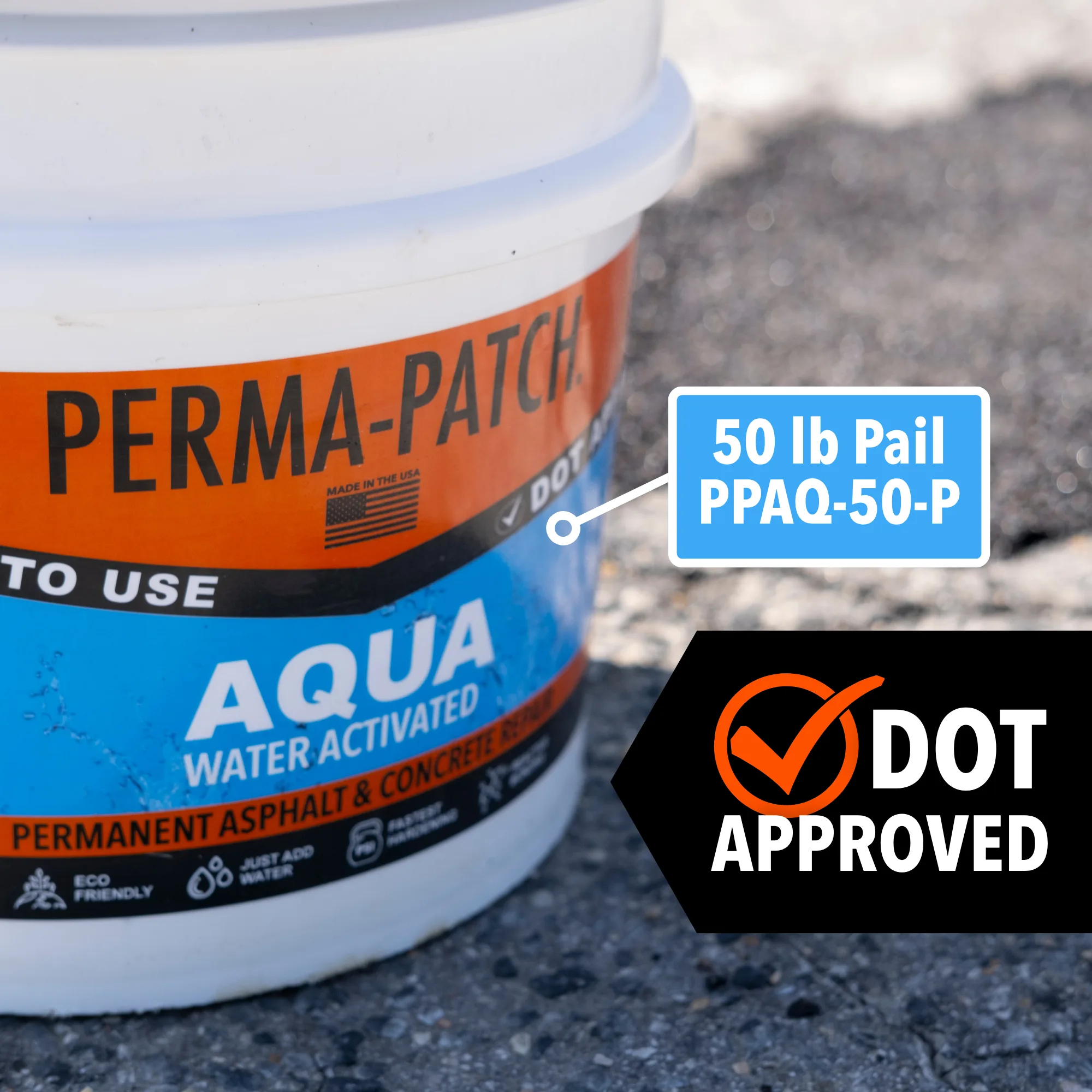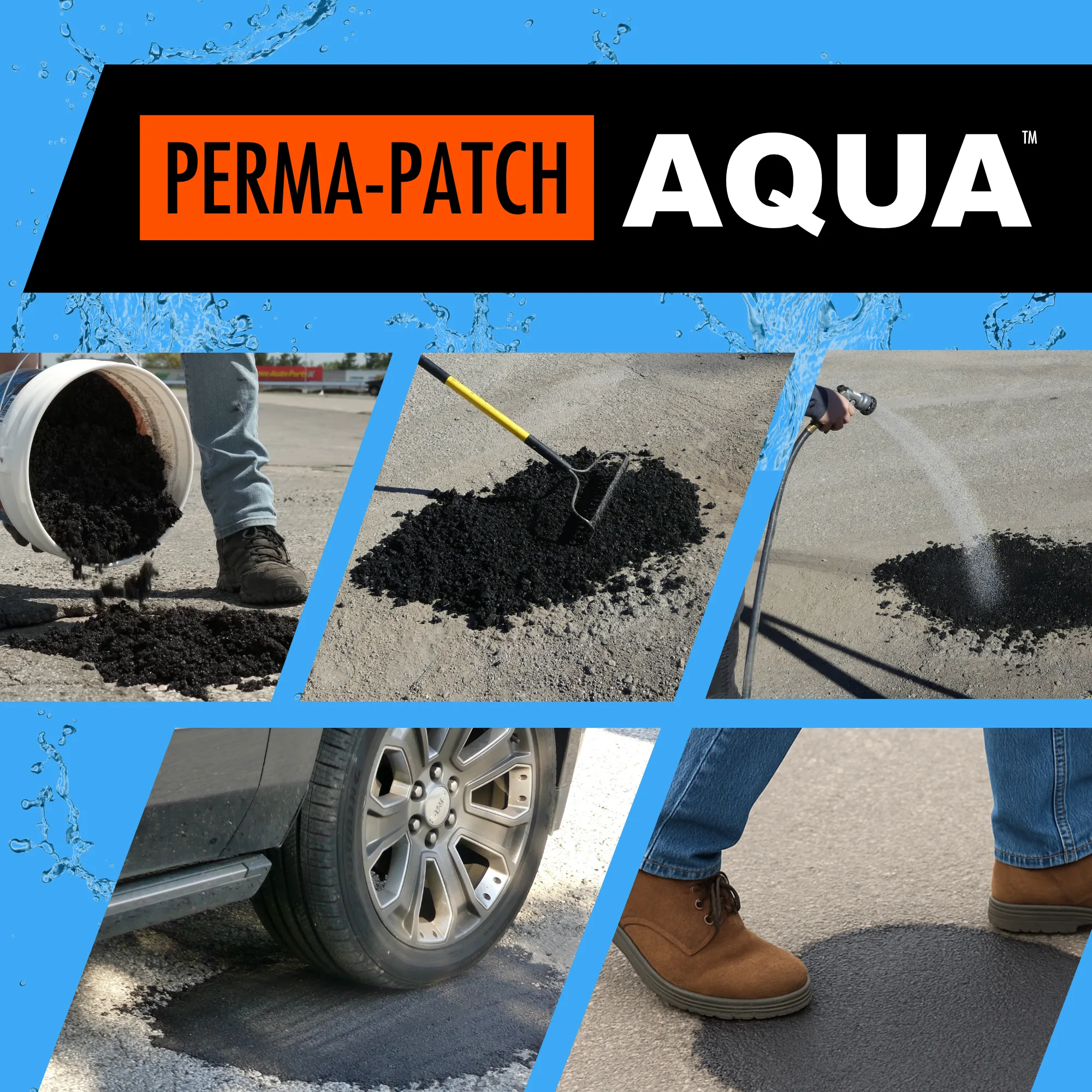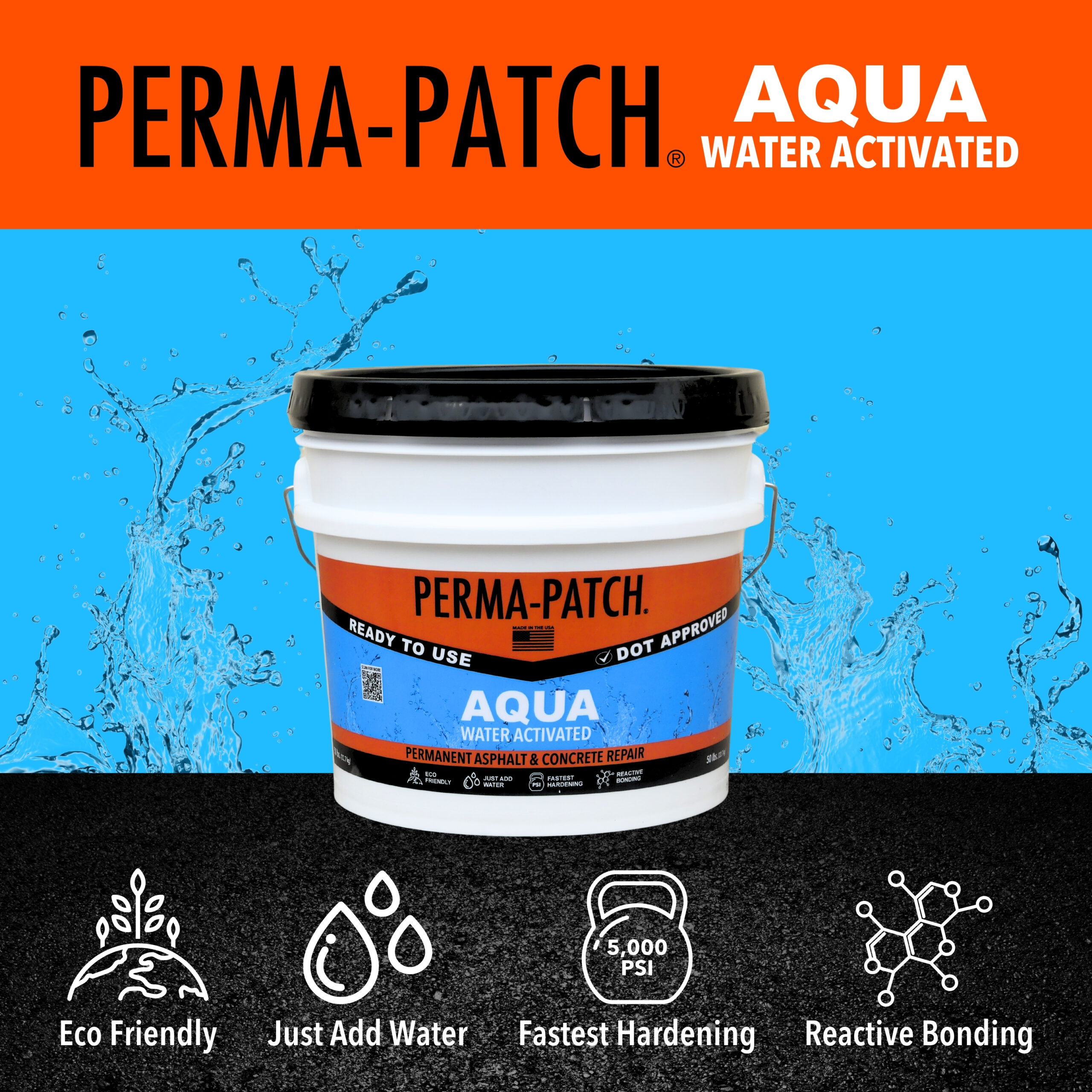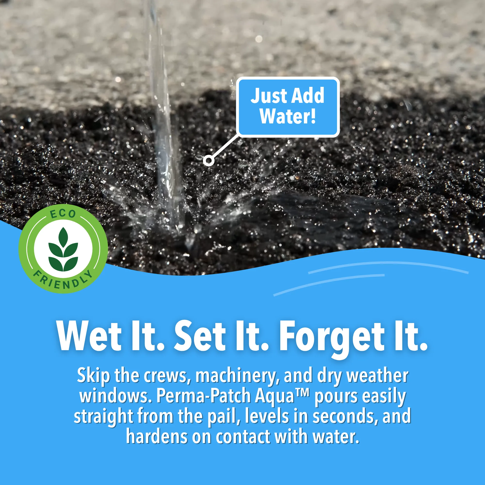 Our Perma-Patch Aqua™ 50 lb Pail is the asphalt repair you’ve never seen before. Wet It. Set It. Forget It. Skip the crews, machinery, and dry weather windows. Perma-Patch Aqua™ pours easily straight from the pail, levels in seconds, and hardens on contact with water.